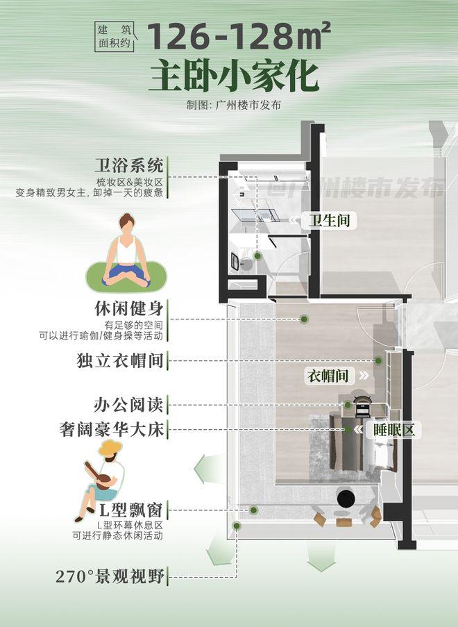 建面约126-128平为例,主卧270°飘窗设计、层高约3m,超过市面大部分约140平二手房。