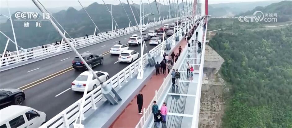 除了一些名胜古迹,这个假期,许多地方的新景观也成为人们打卡的热门地。在贵州,刚刚通车不久的龙里河大桥吸引了不少游客。人们登上大桥,沿着玻璃步道,体验在云端漫步,领略山地峡谷的自然风光,游客们纷纷拍照打卡。